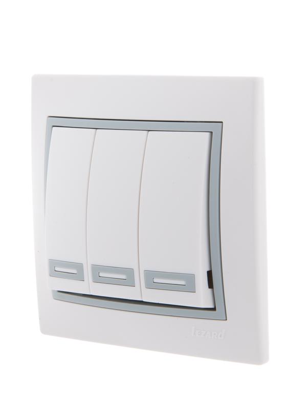 Выключатель 3-клавишный это двухпозиционный коммутационный аппарат с замыкающими (нормально-разомкнутыми) контактами, предназначенный для работы в сетях с напряжением до 1000 вольт, не предназначенный для отключения токов короткого замыкания, без специальных устройств дугогашения, местного управления, с ручным приводом.